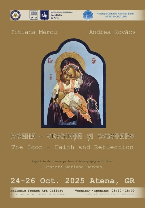 Asociația Culturală Româno-Elenă „Artă și Cultură”, în colaborare cu Departamentul Arte Vizuale al Facultății de Arte, Universitatea din Oradea, organizează în perioada 24–26 octombrie 2025 expoziția de icoane pe lemn „Icoana – Credință și Cugetare”, în prezența artistelor Titiana Marcu și Andrea Kovács.
